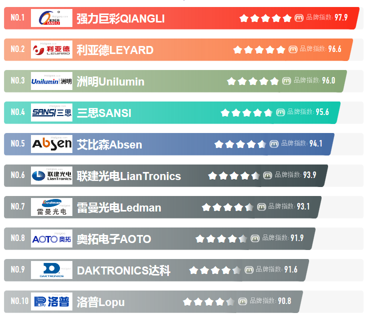 LED顯示屏十大品牌排行:強(qiáng)力巨彩、利亞德、洲明、上海三思、艾比森、聯(lián)建光電、雷曼光電、奧拓電子、羅普等,了解LED顯示屏十大品牌,大家可參照該排名選購(gòu),都是知名品牌、實(shí)力資力都很強(qiáng),質(zhì)量靠譜、售后服務(wù)等也很完善,無需擔(dān)憂。