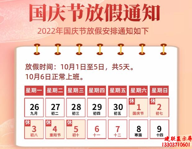尊敬的各位客戶:國(guó)慶節(jié)將至,鄭州LED顯示屏廠家河南建聯(lián)電子科技有限公司祝大家國(guó)慶節(jié)快樂(lè)!